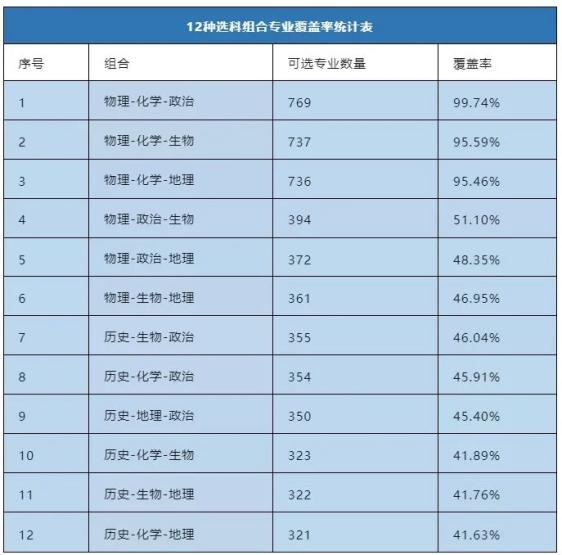 根据教育部公布的选科指引文件,对“物理+化学+政治”等12个选科组合的专业覆盖率(由高到低排列)进行了计算,供广大考生参考。