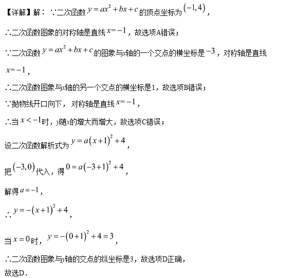 【分析】本题考查了二次函数的性质,待定系数法求二次函数解析式,利用二次函数的性质,对称性,增减性判断选项A、B、C,利用待定系数法求出二次函数的解析式,再求出与y轴的交点坐标即可判定选项D.